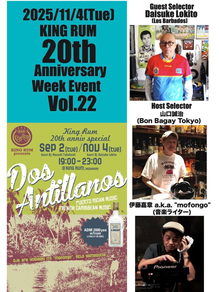 2025年10月28日 / event 11/4(火) 池袋 KING RUM でDJです 池袋の西口に、めちゃくちゃ美味しいラム酒が山ほどあるバーがあります。その名も KING RUM。なんと今年は20周年だそうです。おめでとうございます!来週火曜日(11/4) は、山口誠治さんと伊藤嘉章さんのイヴェント Dos Antillanos に混ぜてもらい、不肖ダイスケ大将もDJ参加いたします。ラム酒にあわせてフレンチカリブ系を中心にセレクト予定。こちらに合わせて 11/1(土)~3(月・祭)のスペシャル・プレートは「フレンチカリブの料理」を予定しております。詳細は追ってお知らせします。